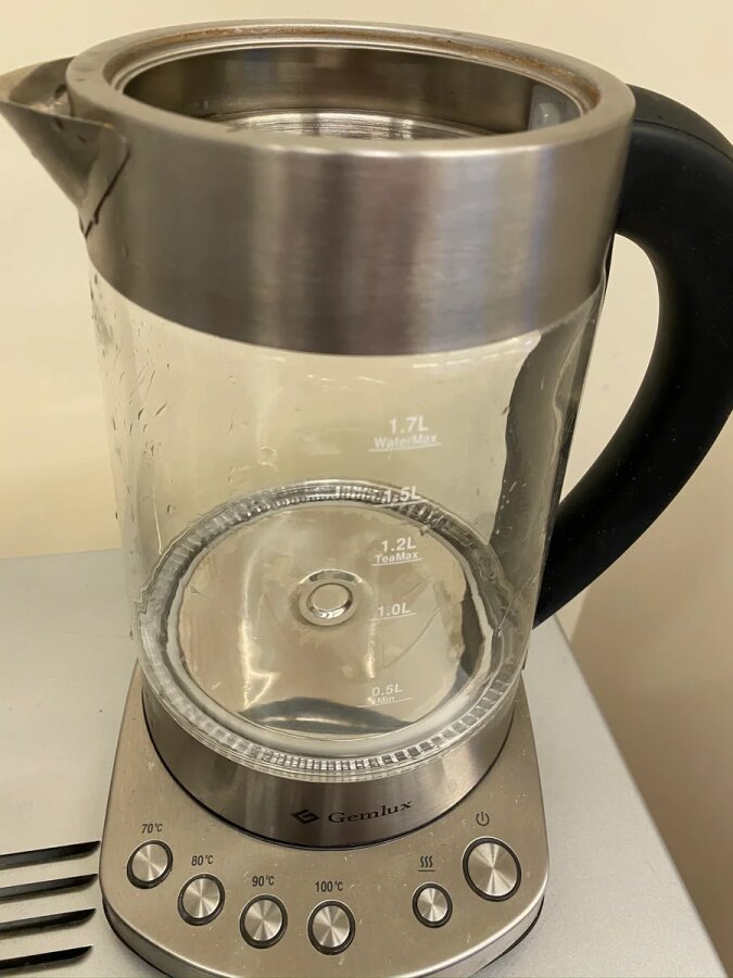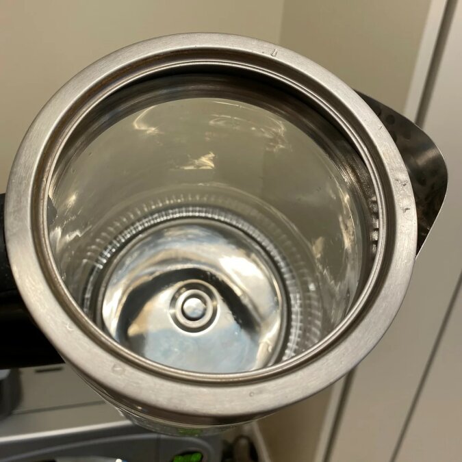 Zagotuj wodę w czajniku (około 300 ml). Wsyp całą paczuszkę kwasu cytrynowego (50 g) do wrzącej wody. Mieszaj czymś drewnianym, aby nie uszkodzić denka i ścian. Odstaw na 5 minut, ponownie wymieszaj. Kilka razy spłucz wodą.