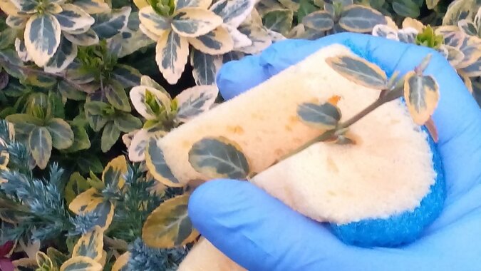 4. Gąbkę można też użyć do zwalczania mszyc. Należy ją zwilżyć chemicznym środkiem owadobójczym (na przykład fitoermą) i delikatnie smarować gałąź ze szkodnikami.