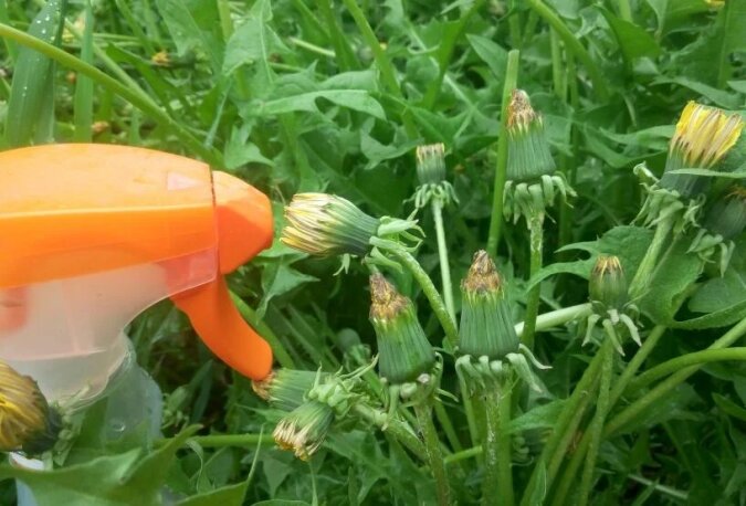 Rozcieńczamy ocet z wodą w stosunku 1: 3, dodajemy łyżkę soli. Wlewamy do butelki z rozpylaczem i dodajemy 1 łyżeczkę detergentu. Jest to konieczne, aby roztwór lepiej utrzymywał się na trawie.