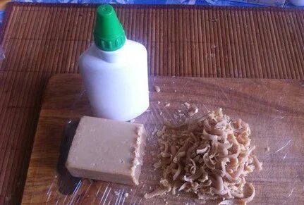 Proces rozpoczynamy od nalania wody do dużego naczynia i wstawienia go na ogień. Gdy woda zacznie wrzeć, dodajemy do niej klej i starte mydło. Mieszamy, aż wióry mydlane całkowicie się rozpuszczą.