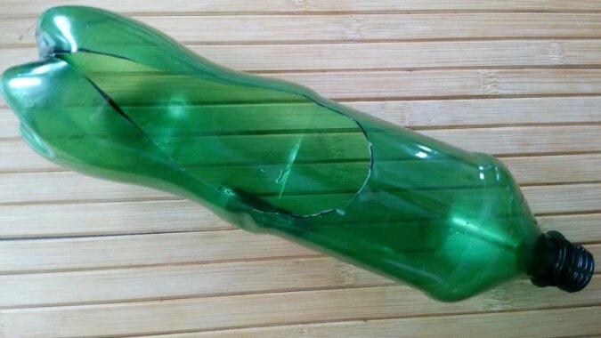 W ścianie butelki wycinamy "okno" w kształcie płatka jak u kwiatu. Najpierw lepiej będzie narysować kontur "płatka" markerem na butelce.
