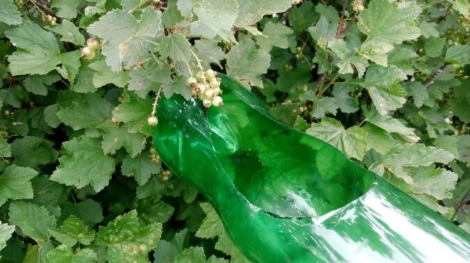Używamy urządzenia pod pęczkami jagód i ciągamy. Gałązki, na których trzyma się jagody, wpadną w wąską szczelinę-płatek na butelce, zostaną przecięte przez szczelinę — i wpadną do otworu w butelce. W ten sposób możesz nazbierać przez 1 minutę litr jagód.