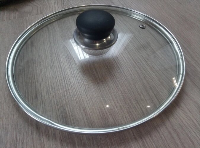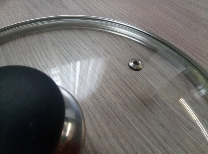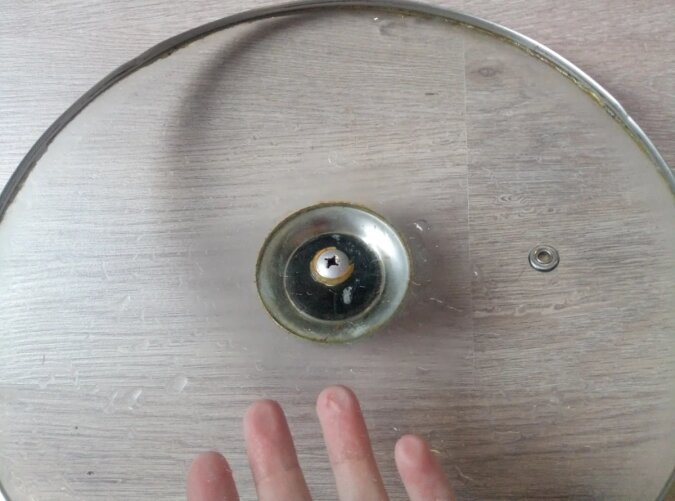 Na powyższym zdjęciu jest nasza bohaterka – brudna pokrywka do patelni. Ma zdejmowany uchwyt – nie wiem, czy robią teraz inne, ale jako przykład pokażę na tej.