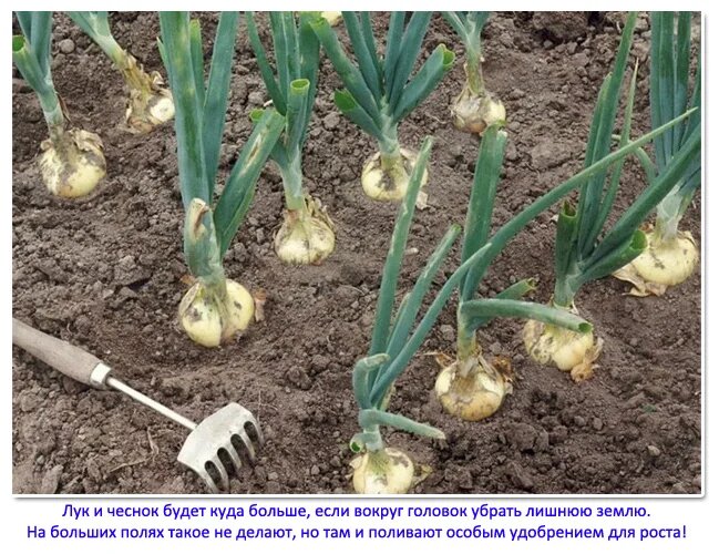 Nie jest konieczne wykopywanie korzeni z ziemi: w pierwszym etapie konieczne jest aby główka cebuli lub czosnku wyjrzała z ziemi 1/3 lub ¼ swojej wielkości.
