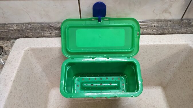 Jak umocować całą tą konstrukcję – zależy to od położenia zlewu i kranu. W mojej sytuacji było najwygodniej zawiesić samoprzylepny haczyk na kafelku i zawiesić na nim pojemnik.