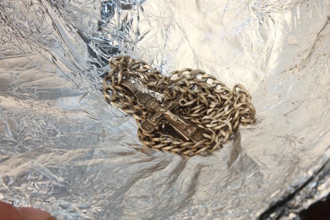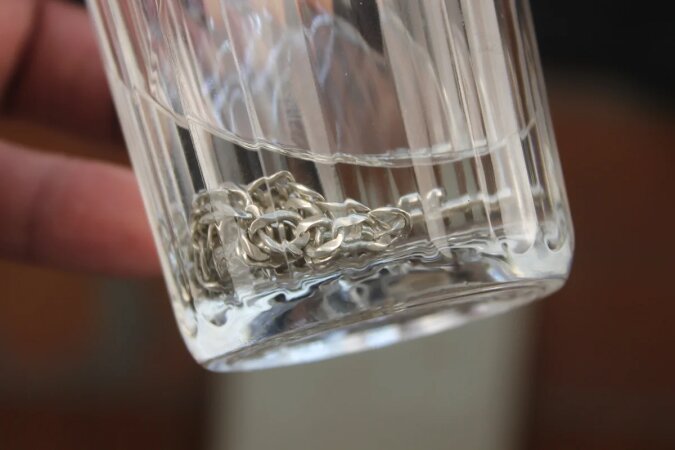 Po pięciu minutach wyjmujemy łańcuszek i ponownie płuczemy pod wodą. Dodałem kilka zdjęć, abyś mógł porównać wynik.