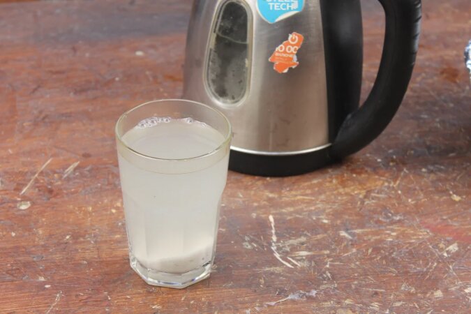 Do szklanki wsypujemy dwie łyżki soli i zalewamy wrzącą wodą. Dokładnie mieszamy. Nawiasem mówiąc, sól będzie wyglądała trochę dziwnie – nabierze szarego koloru.