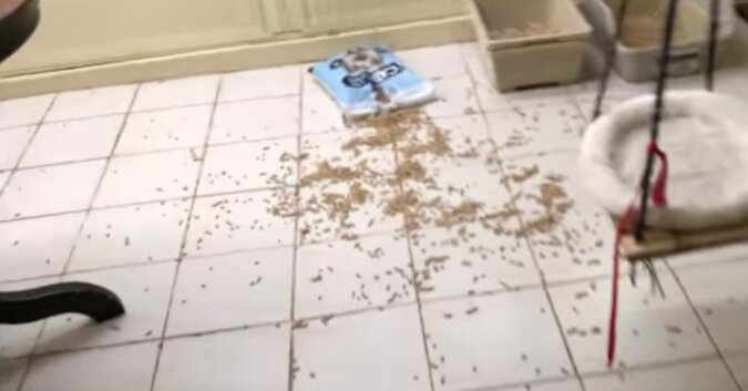 Mężczyzna, który wszedł do swojego domu, zobaczył następujący obraz: ktoś podarł paczkę wypełniacza do żwirków i rozrzucił ją po całej kuchni.