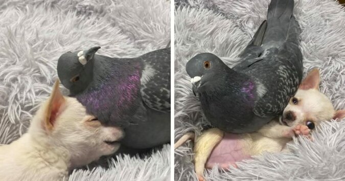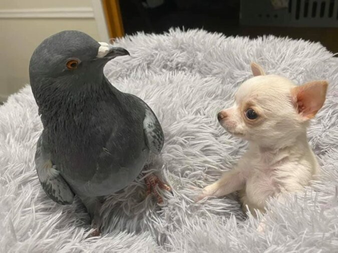 Raz się spotkali i od razu się polubili. To było w funduszu o nazwie The Mia Foundation. Jego specjaliści zajmują się zwierzętami z wadami wrodzonymi. Na przykład, gołąb w ogóle nie lata, a tylne nogi chihuahua „nie działają”. Tak więc po tym spotkaniu między ptakiem a psem nawiązała się bardzo wzruszająca i silna przyjaźń. Materiał filmowy na temat tych relacji można zobaczyć w Internecie.