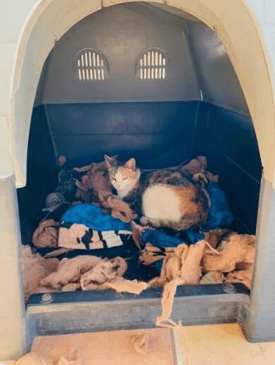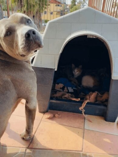 Zdumiewające, ale groźny pies dał kotce swój dom, a nawet przyniósł z domu swoją ulubioną ściółkę. Ogólnie rzecz biorąc, zorganizował wszystko, aby kot mógł wygodnie uwolnić się od ciężaru.