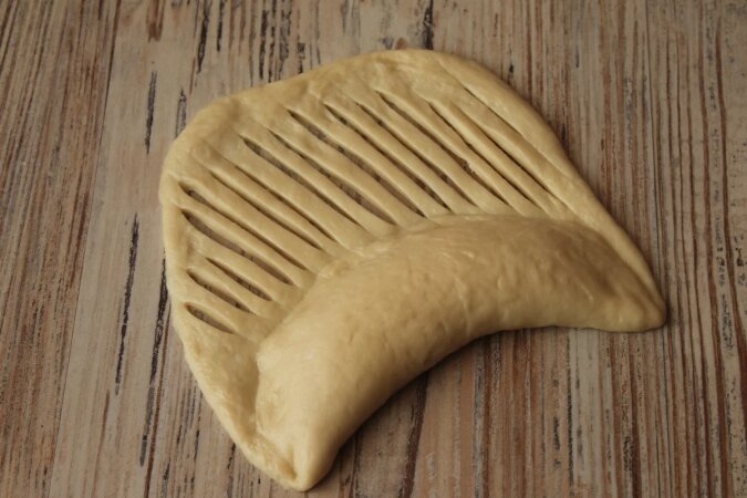 Wałkujemy każdy kawałek jeden po drugim, posypując trochę mąki na ciasto. Na jednej krawędzi kładziemy nieco więcej niż łyżeczkę nadzienia. Zamykamy nadzienie ciastem, mocno dociskając krawędzie. Na wolnej krawędzi wykonujemy skośne cięcia.