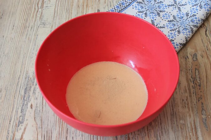Wlewamy ciepłe mleko do głębokiej miski, wsypujemy łyżkę drożdży i mieszamy. Granulki drożdży powinny rozpuścić się w mleku.