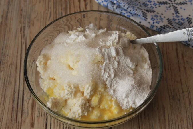 Do twarogu dodajemy jajko, wanilinę, cukier, skrobię ziemniaczaną i przecieramy łyżką lub widelcem. Nie potrzebuje to zbyt dużo wysiłku – jeśli długo będziemy mieszać, nadzienie z twarogu wyjdzie się zbyt płynne i może wyciec z bułeczek.
