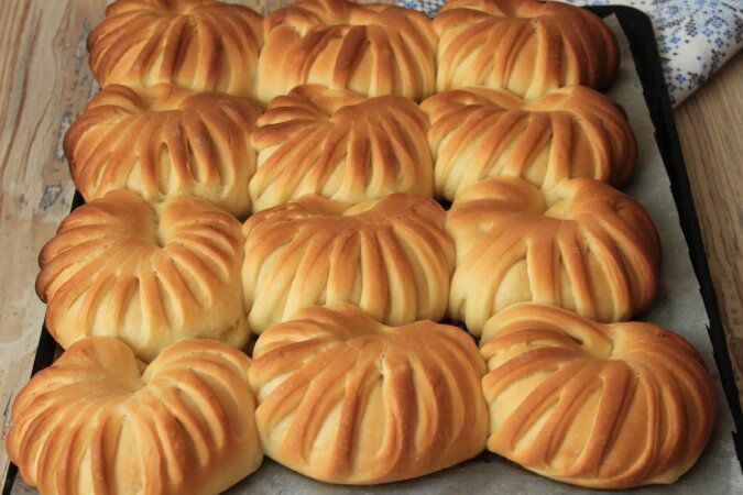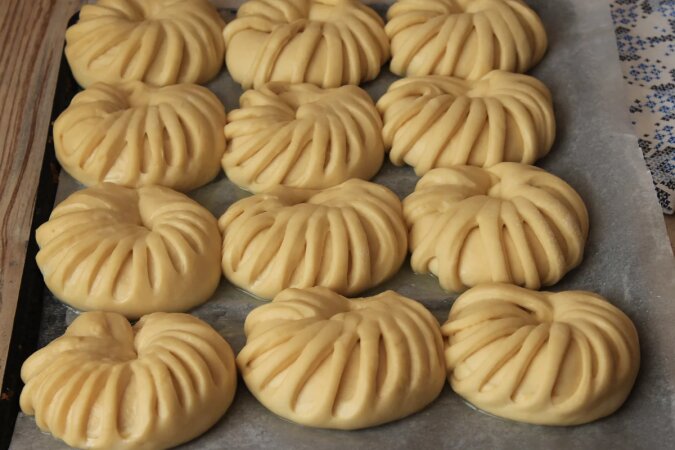Uformowane bułeczki kładziemy na blasze do pieczenia pokrytej pergaminem, przykrywamy ręcznikiem i pozostawiamy na 20 minut. Następnie smarujemy żółtkiem lub po prostu mlekiem. W moim przypadku była ta druga opcja.