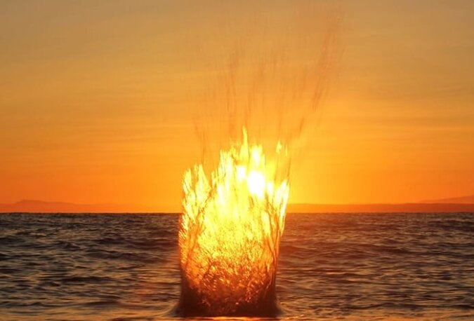 Plusk-od wrzuconego do wody kamienia podczas zachodu słońca