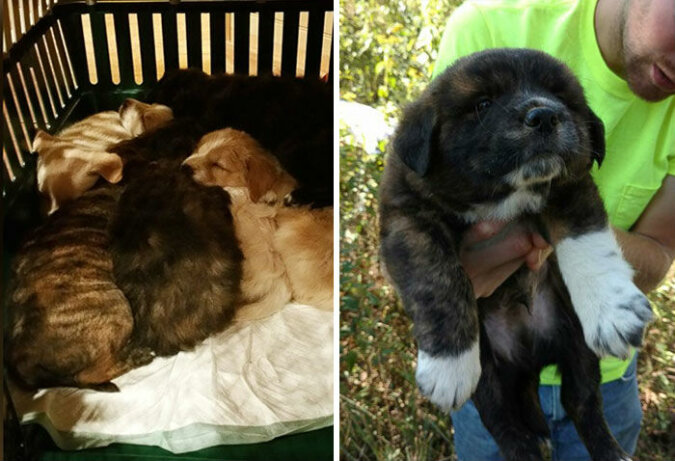 Przyjaciele poszli za suczką i zobaczyli dziurę w ziemi. Patrząc tam, chłopaki zauważyli na dole siedem małych szczeniąt, których futro było całe posklejane ziemią.