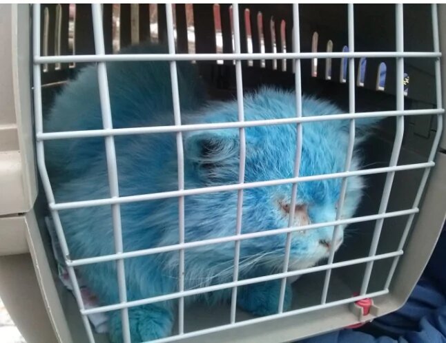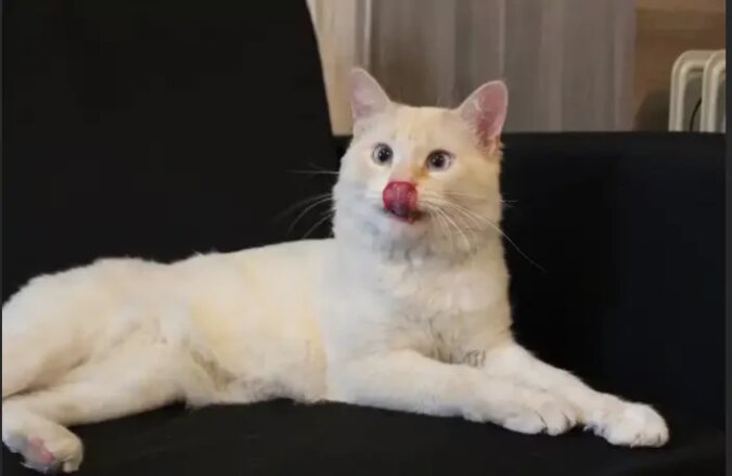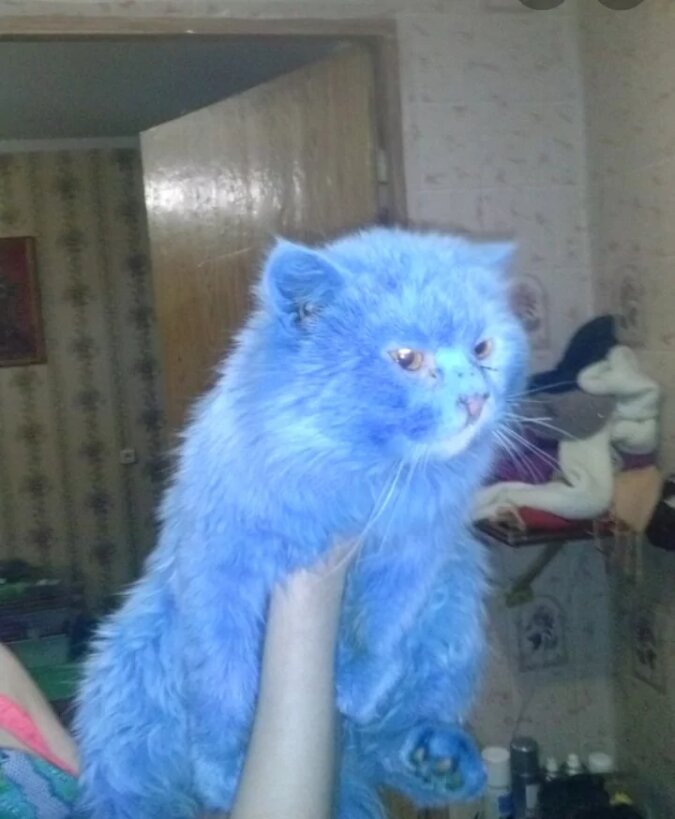 Po kilku zabiegach higienicznych farba zaczęła się zmywać, więc kot najpierw stał się jasnieszy, a po miesiącu był całkowicie biały!