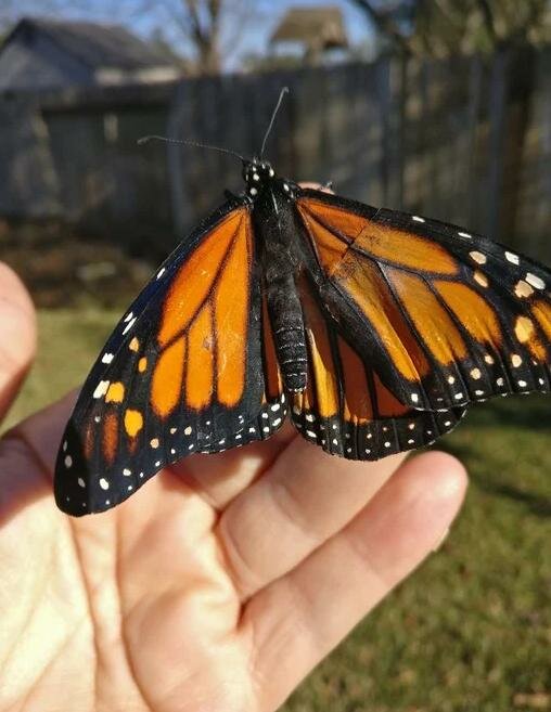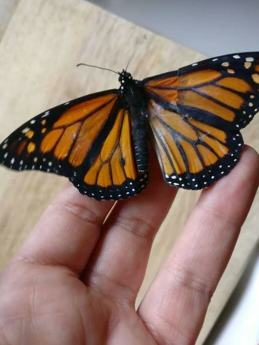 Romy zauważyła, że jeden z monarchów ma oderwane skrzydło, które najwyraźniej zostało uszkodzone w procesie przepoczwarzenia. Dziewczyna nie zawahała się pomóc owadowi.