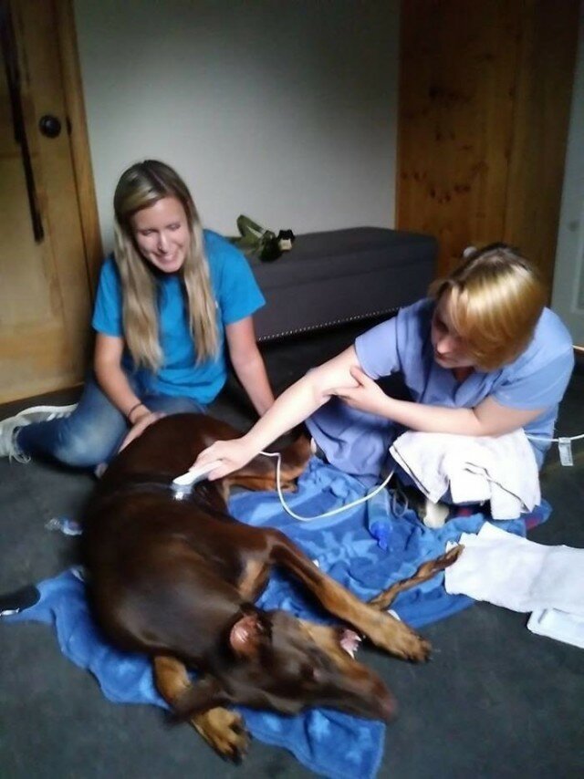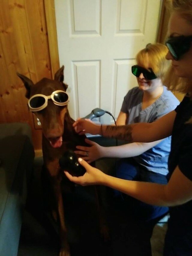 Weterynarze zalecili laserową terapię, aby poprawić mobilność psa.