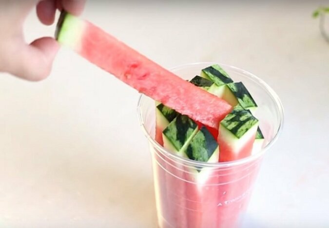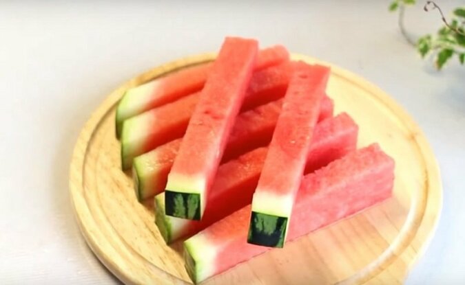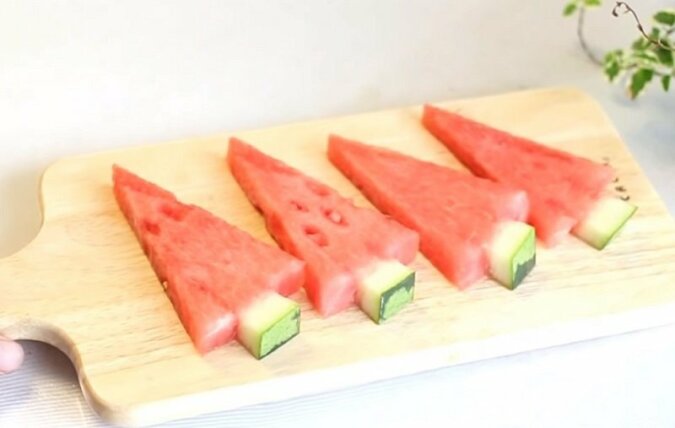 Oddziel zewnętrzne paski skórki od miazgi i pokrój pozostały arbuz na cienkie kawałki. Powstałe kawałki wyglądają bardzo malowniczo i przypominają małe choinki, które można wygodnie trzymać za zielony „pień”.