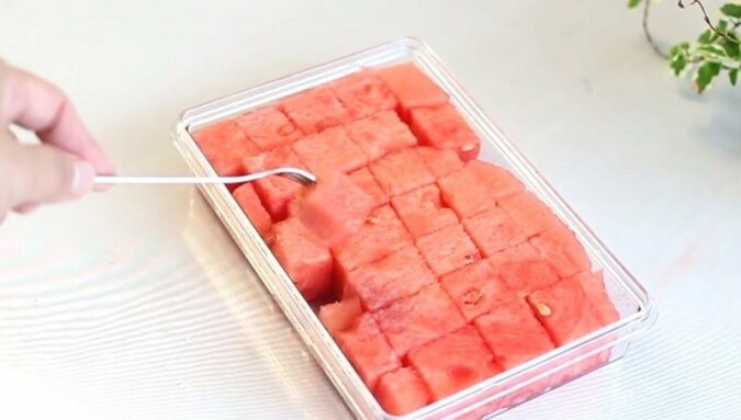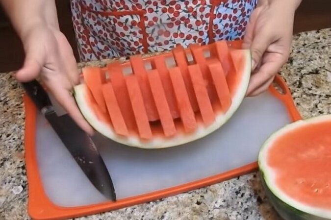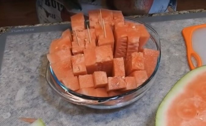 Krojenie arbuza w amerykańskim stylu wygląda imponująco, ale do wygodnego jedzenia potrzebne są paluszki do szaszłyków lub widelce.