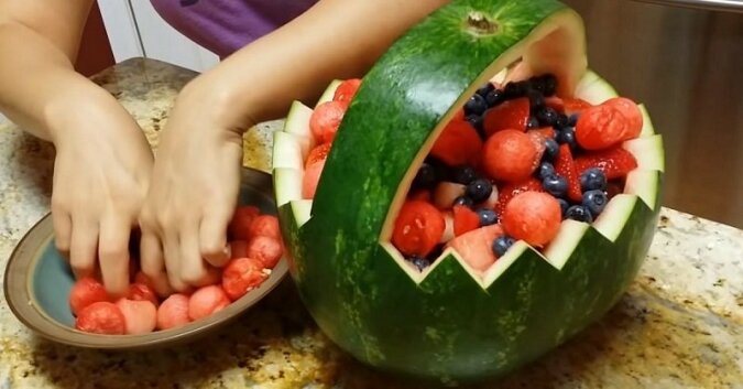 Wyciągnij cały miąższ z arbuza. Jeśli zrobisz to okrągłą łyżką do lodów, otrzymasz słodkie kulki arbuzowe. Wymieszaj je z dowolnymi jagodami i kawałkami owoców. Napełnij koszyk powstałą mieszanką. Założę się, że taki arbuz będzie hitem każdego stołu!