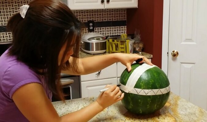 Aby to zrobić, przyklej taśmę do arbuza i narysuj na niej pożądany wzór. Następnie ostrym nożem wykonaj cięcia wzdłuż linii wzoru i usuń pozostałoci taśmy.