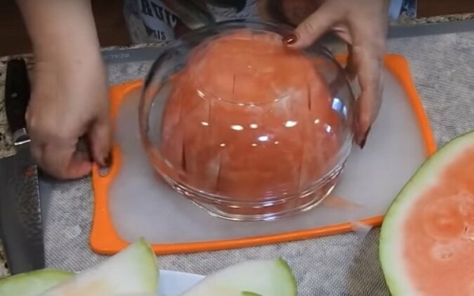 Następnie powtórz cięcia w poprzek jak w powyższej metodzie. Przykryj pokrojonego arbuza odpowiednią miską i przewróć, jedną ręką trzymając deskę do krojenia, a drugą miskę.