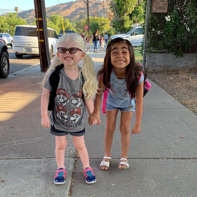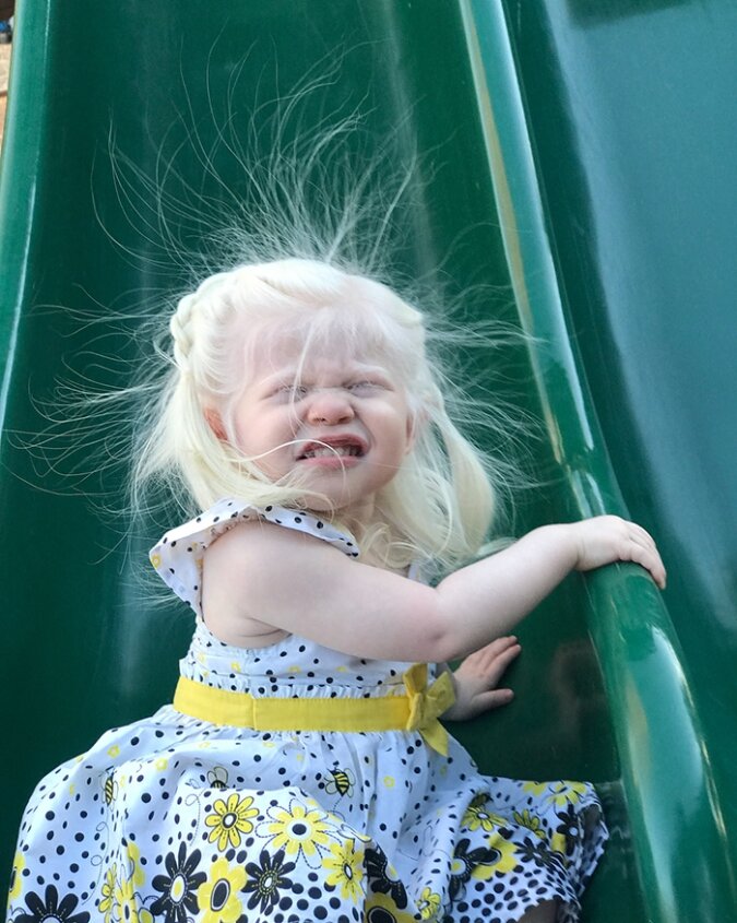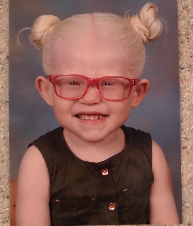 Na zewnątrz musi cały czas nosić okulary przeciwsłoneczne, ponieważ jej oczy są zbyt wrażliwe na światło słoneczne.