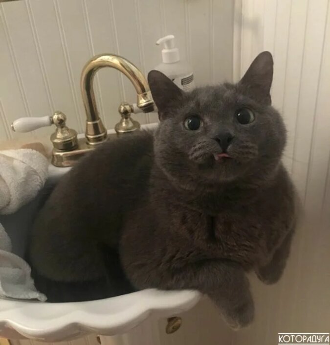 Jak koty uwielbiają spać w zlewach. Czasami też mając takie miny, jakby to miejsce zawsze należało do niego i nawet nie wiedział o żadnych higienicznych zabiegach. Dlaczego więc w domu są dwie umywalki? Więc jedna jest dla kota! To proste.