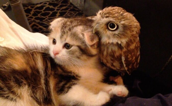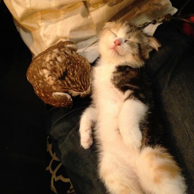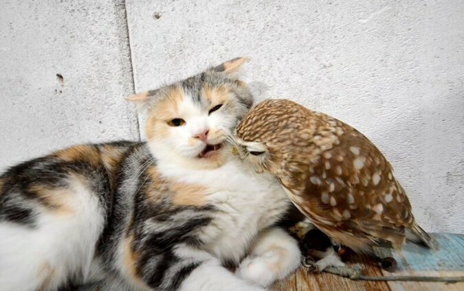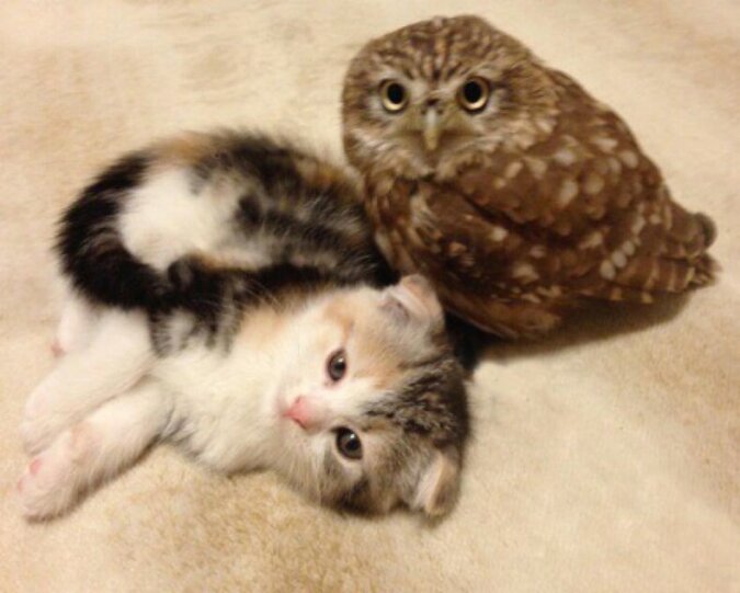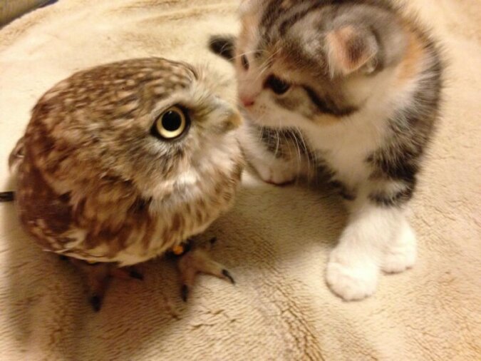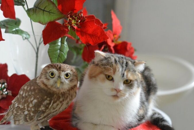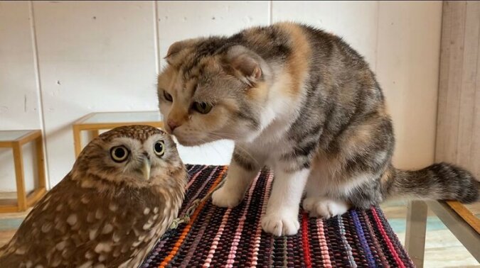 Bardzo mała Marimo została przywieziona, aby sowa Fuku-chan nie była samotna. Zaskakujące jest to, że zwierzęta tych różnych gatunków od razu znalazły wspólny język. Kociak zaczął bawić się z ptakiem, jakby on też był kotem.
