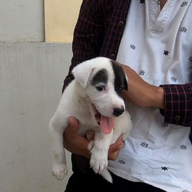 Nikt nie wiedział, jak długo stał tam szczeniak, który miał białą sierść, a także czarną obwodkę wokół oka. Wyglądał on na bardzo smutnego oraz zdezorientowanego zwierzaka.