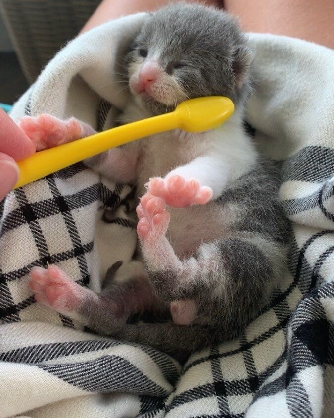 Jednak kotek okazał się odważnym zwierzakiem, choć był bardzo malutki. Dzielnie zniósł wszystkie próby. Zjadł tyle, ile mógł umieścić jego mały żołądek. Po prostu umiał odważnie walczyć o przetrwanie.