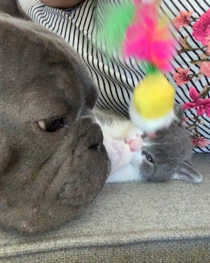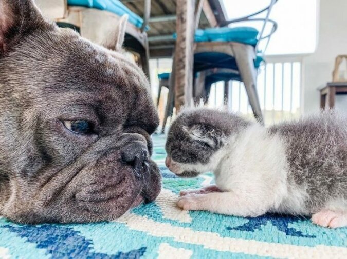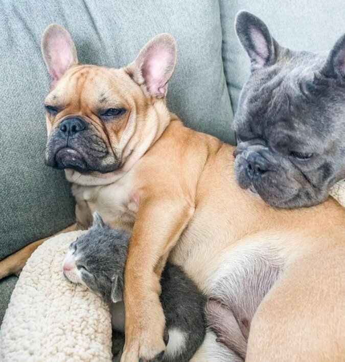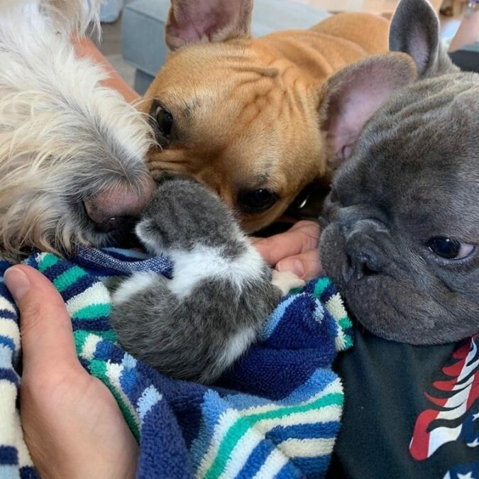 Wszystkie trzy duże psy zareagowały bardzo przyjaźnie na pojawienie się w domu malutkiego kota. Więc Frenchy polizała jego twarz, jednak zrobiła to tak delikatnie i ostrożnie, jakby była jego matką.