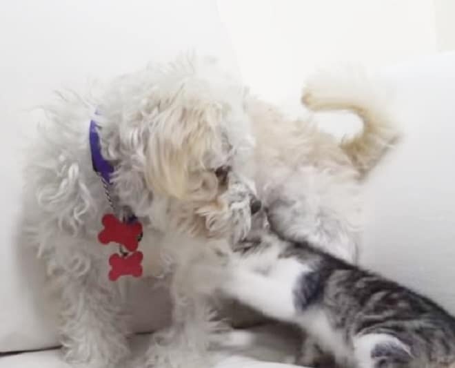 Aby pies w nowym miejscu się nie nudził, został od razu przedstawiony... kotu. A jak wiadomo, koty od dawna patrzą na psa jak na równych sobie. Więc kot od razu wykazał zainteresowanie do nowego „mieszkańca”. Natychmiast zaczęli biegać i bawić się razem, jakby od dawna byli nierozłącznymi przyjaciółmi.