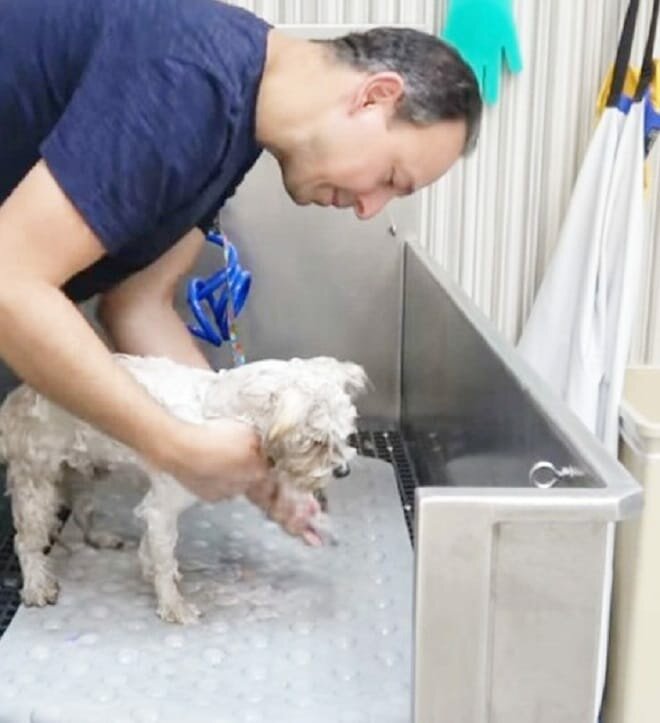 Tego brudnego kudłatego psa trzeba było najpierw wykąpać. Miękkie, pachnące mydło i ciepła woda doskonale zmyły cały brud z włóczęgi. Wykąpany i umyty Konan był po prostu nie do poznania!