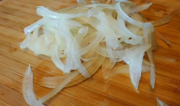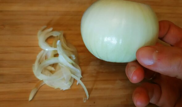 Cebulę siekam z samej krawędzi połówki cebuli, tuż nad talerzem. Dzięki temu deska nie brudzi się, a cebula przekształca się w schludne piórka w zaledwie kilka sekund. Kierunek - od szczytów do korzeni, jest oczywiste dla każdej gospodyni. Powstała słomka jest bardzo ładna, a co najważniejsze - tej samej grubości.