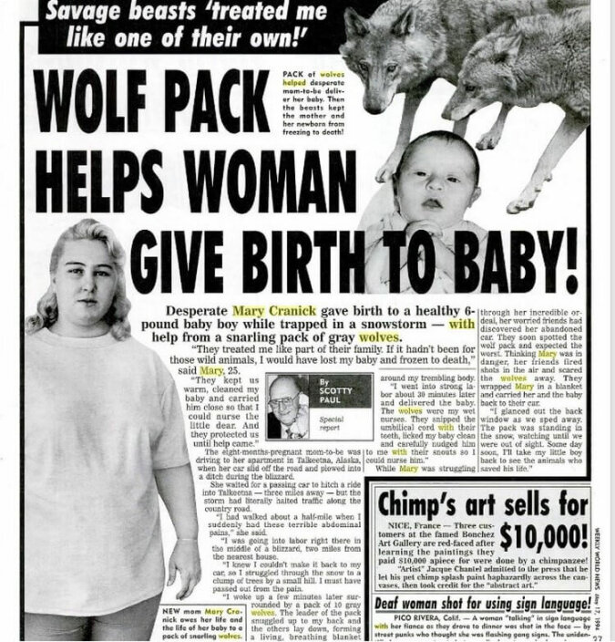 Uwięziona w śnieżnej pułapce Amerykanka Mary Kranik urodziła zdrowe dziecko o wadze 3,4 kg. W czasie porodu pomagała jej wataha wilków, która niejako asystowała przy porodzie.