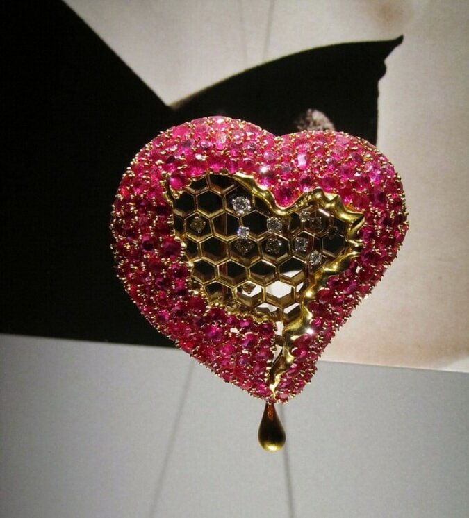 S. Dali, K. Alemani. Broszka „Serce z komurek pszczelich”, 1949, złoto, brylanty, rubiny