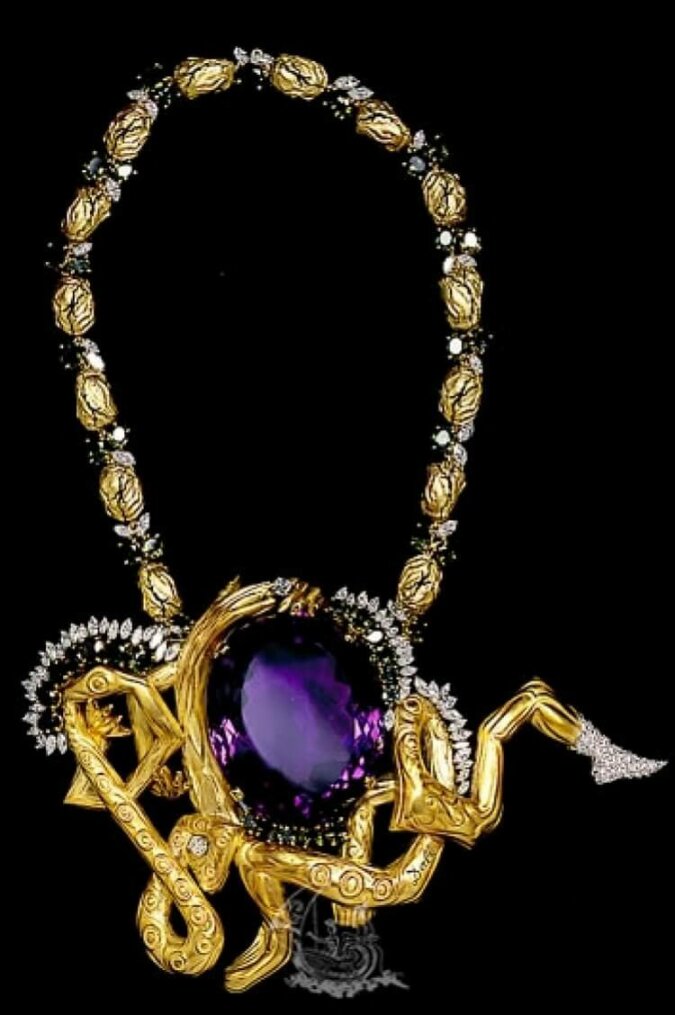 S. Dali. „Naszyjnik ze spłątanymi kończynami” (naszyjnik choreograficzny), około 1964, złoto, diamenty, ametyst, szafir