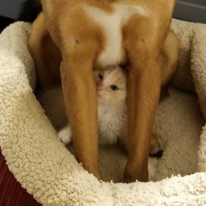 Pies Turbo zaczął badać jasnorude kociaki z białymi plamami. Pies był gotów udzielić wszelkiej możliwej pomocy. Postanowił też zająć się kociętami.