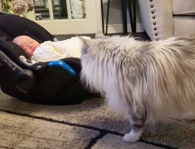 Ale najfajniejszy monet nastąpił, gdy Milo wszedł do pokoju! Z początku dumny kot w ogóle nie rozumiał, dlaczego wszyscy się zebrali, a potem z oburzeniem spojrzał na dziecko, które spokojnie drzemało. Jego ogon zaczął się poruszać z boku na bok, a sierść lekko się zjeżyła.