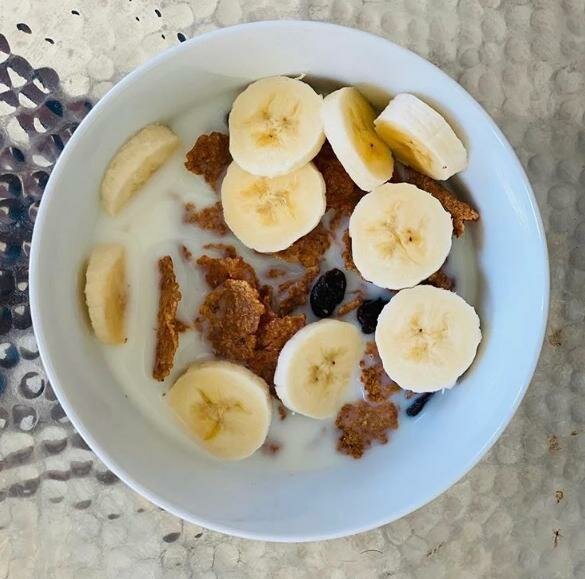 Kilka godzin po śniadaniu była przekąska składająca się z jogurtu z kawałkami świeżych owoców. Czasami kobieta dodawała do nich kawałek chleba zbożowego, który smarowała masłem orzechowym.