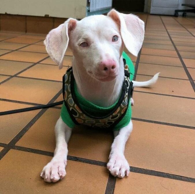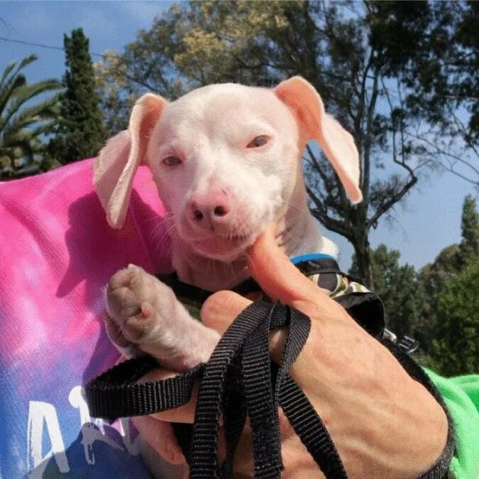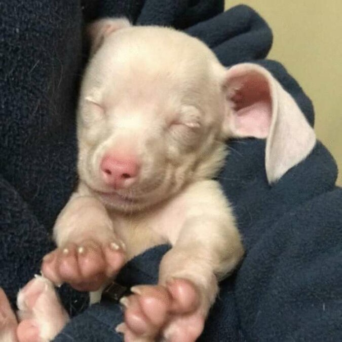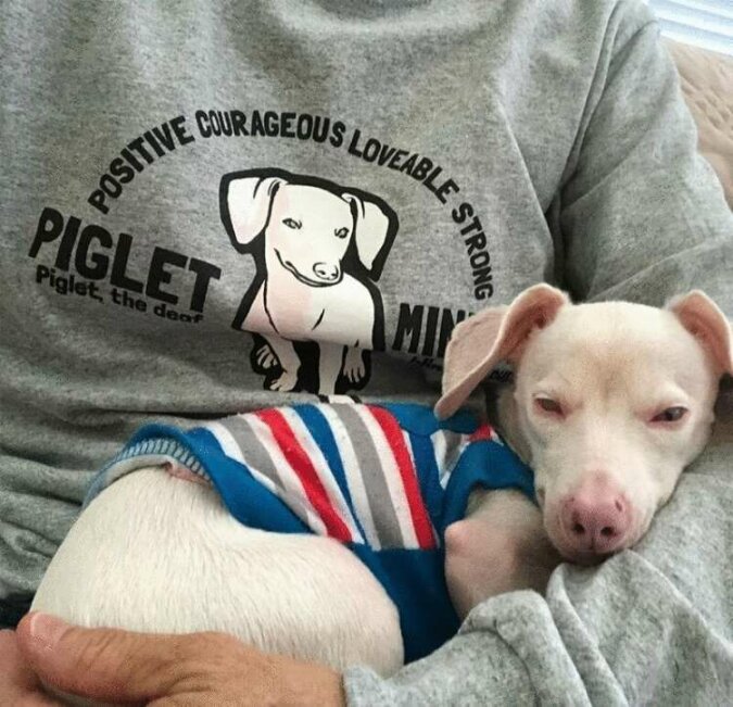 Szczeniak o imieniu Prosiaczek urodził się niezwykły pod każdym względem - on okazał się różowawy, a także niewidomy i głuchy. Ale wszystkie te małe rzeczy nie stały się przeszkodą w pełnosprawnym życiu psa - znaleźli mu rodzinę, która go uwielbia.