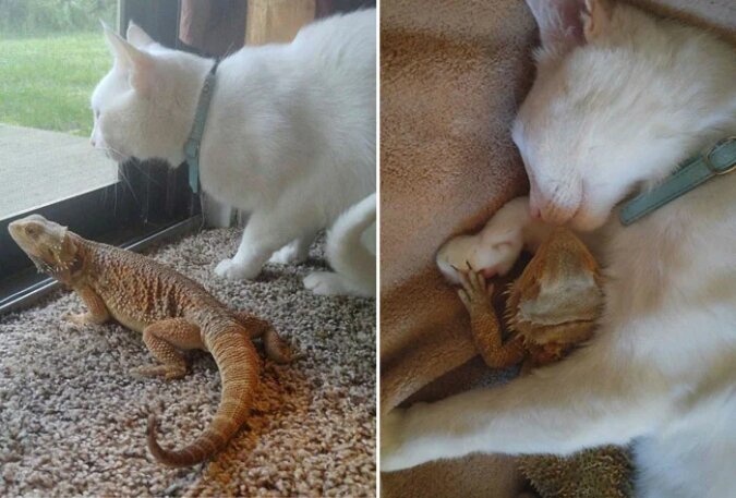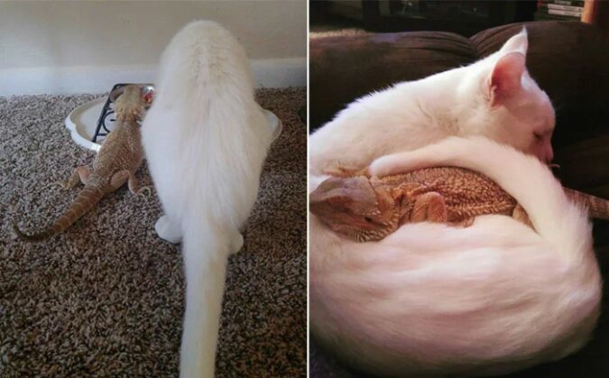 O tym, że koty mogą spokojnie dogadywać się z psami, opowiedziano wiele wzruszających historii. Jednak dużo ludzi ma w domu egzotyczne zwierzęta. Nawet z nimi kotom udaje się nawiązać ciepłą przyjaźń. Jednym z takich przykładów jest puszysty biały kot o imieniu Maluch i brodata jaszczurka o imieniu Charles.