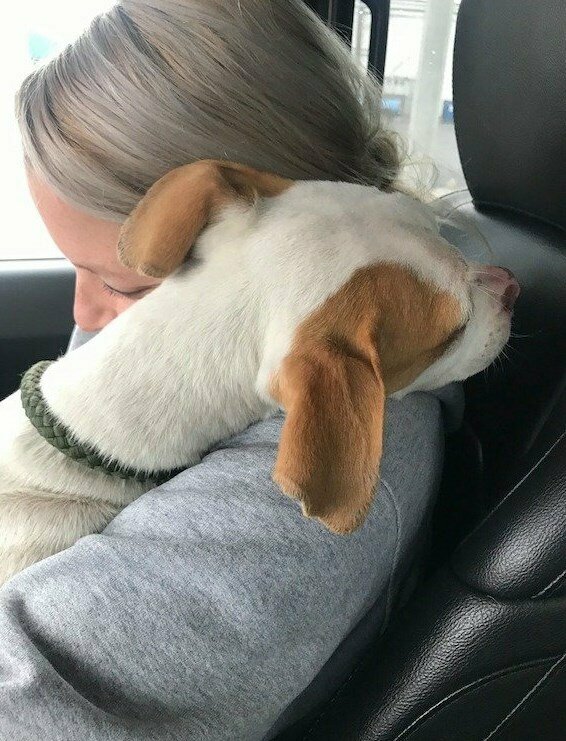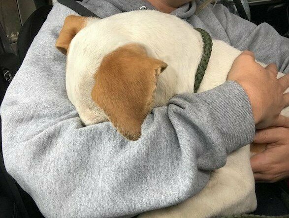 Kiedy przybyła pomoc i szczeniak zobaczył tylu nieznajomych ludzi, był przestraszony, ale jednocześnie radośnie merdał ogonem. Najwyraźniej rozumiał, że nie chcieli go urazić. Ratowniczka wzięła biednego szczeniaka w ramiona, a on natychmiast schował nos w jej rękawie, niby w ten sposób chciał się ukryć przed wszystkimi problemami. Szczeniak miał plamy na pysku, było jasne, że wielokrotnie czyniono mu krzywdę.