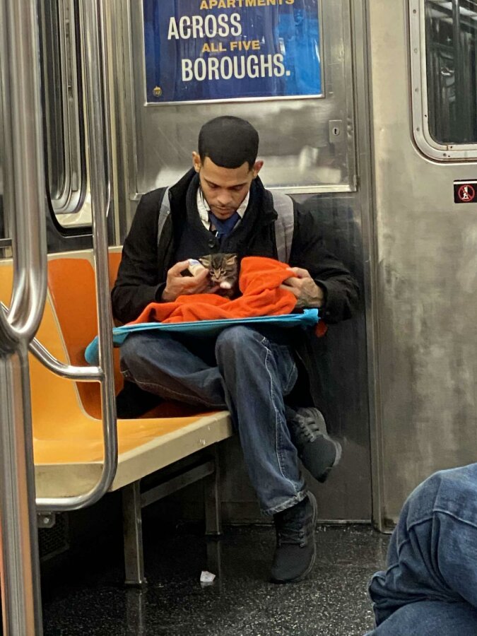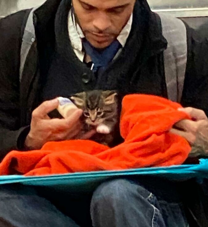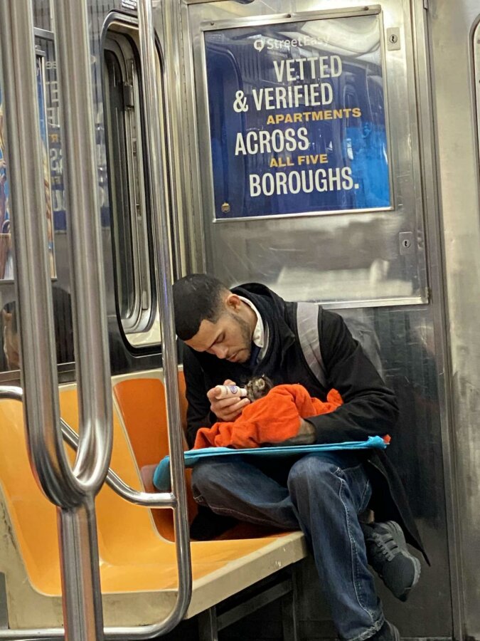 To był kociak i to bardzo głodny! Mężczyzna ostrożnie zawinął dziecko w koc i starannie karmił z butelki. Widok, którego najmniej spodziewasz się zobaczyć w metrze dużego i obojętnego miasta.