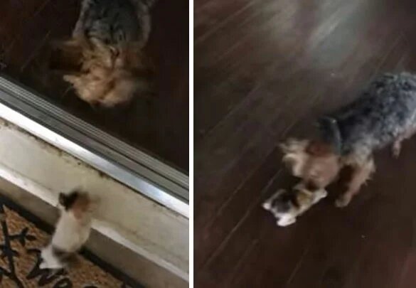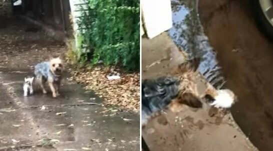 Okazało się, że Hazel nie mogła przejść obok jęczącego w deszczu małego kotka i postanowiła zabrać dziecko do swojego domu. Biedny kotek ruszył naprzód, po czym zatrzymał się niepewny. Widać było, że nie wiedział, czy może całkowicie zaufać psu i dokąd go prowadzi. Ale Hazel cały czas pocieszała małe. Monica zdała sobie sprawę, że musi jak najszybciej pobiec po telefon i mieć czas na sfilmowanie tej pięknej sceny.
