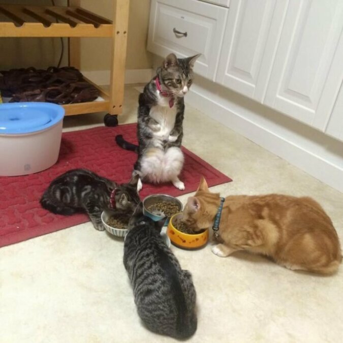 O Kandze został nakręcony krótki film i opublikowany w sieci. Tak kobieta o imieniu Joyce dowiedziała się o niezwykłym kocie. Joyce miała już w domu osobliwe mruczki, więc wiedziała, jak opiekować się Kangą. Inni koty chętnie przyjęły nowego zwierzaka. Kotka dorastała w dobrym towarzystwie i po chwili zaczęła opiekować się małymi kociętami, które przyniosła kobieta. A kiedy w domu pojawiło się małe z tą samą wadą co Kenga, kotka stała się jego prawdziwą matką. Jest stale z dzieckiem i nieustannie się nim opiekuje.