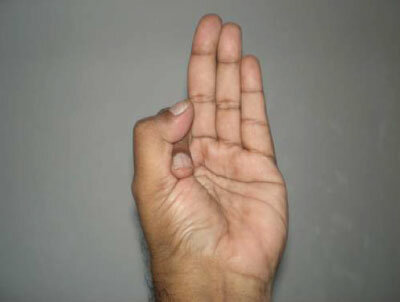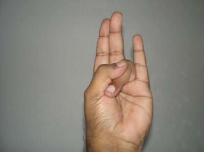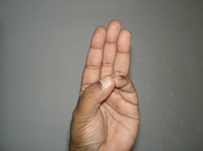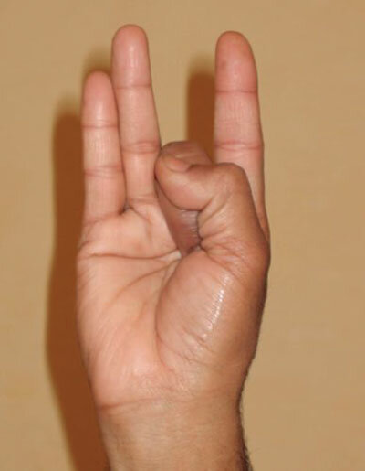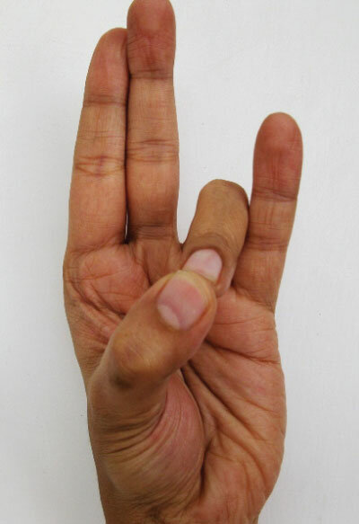 Wykonanie: Przytrzymanie palca serdecznego kciukiem i wyprostowanie reszty palców.